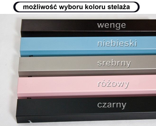 Możliwość zmiany koloru stelaża lampy. Dostępne kolory: wenge, niebieski, srebrny, różowy, czarny.