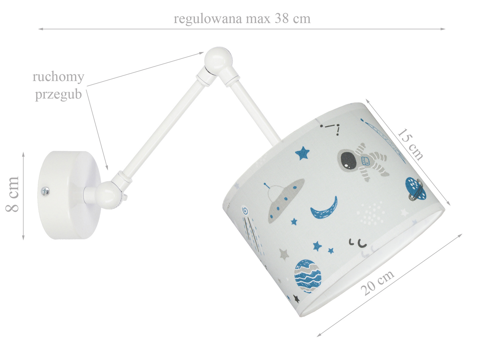 • Ten uroczy kinkiet to idealne rozwiązanie do dziecięcego pokoju! Jego biały stelaż jest delikatny i pasuje do każdego wnętrza, a abażur z motywem kosmosu wprowadza magiczny, marzycielski klimat. Dzieci będą zachwycone, patrząc na gwiazdy i planety, które